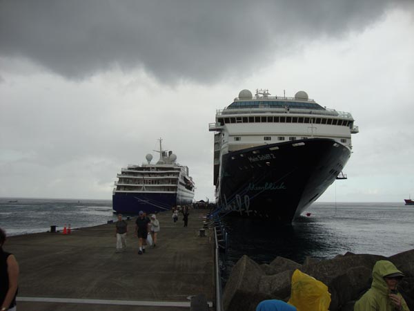 Wait ’til you see the photos below of our little Semester-at-Sea ship docked next to this gigantic German ocean liner. Until today I thought the Explorer (our ship) was big but now I see we’re just little pip-squeaks on the sea!