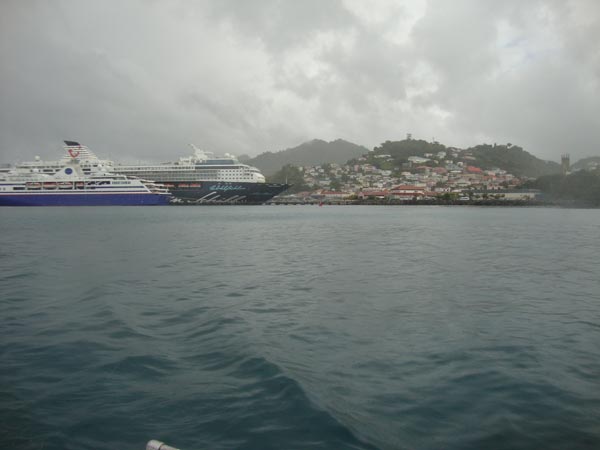 Early this morning we docked in Greneda (West Indies) … the “spice island”. The capitol is St. George and that’s also where the docks are. Today Lois and I went our separate ways… she isn’t back yet from her Island tour. I chose to join up with a whale and dolphin spotting excursion that left right from the pier. Today is a rainy and pretty rough day on the water so I have to admit my tummy was a little unhappy with the 4 hour trip in a small boat. But the good news is that we saw lots of dolphins, tho’ no whales today. It rained on and off all morning which made for some pretty light when the sun peeked thru. I didn’t have a ton of success photographing the fast-moving dolphins but I’m including one photo just to give you an idea of what we saw. There were dozens of them all around our little boat and I think we were maybe 2 or 3 miles off shore.